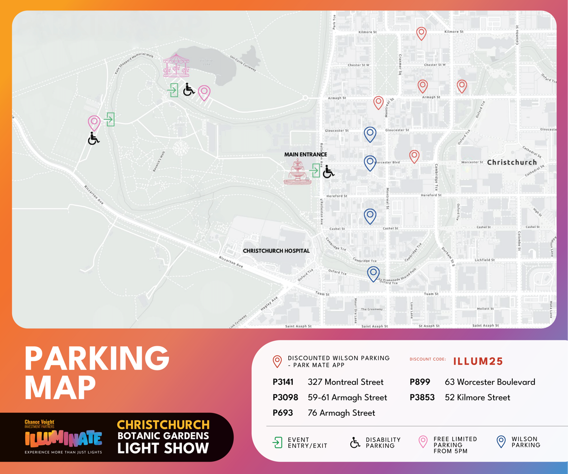Wilsons Discounted Parking: Use the discount code "ILLUM25" via the Park Mate app at the following Wilsons car parks. ($5 for parking, valid for 3 hours from the start of the session).